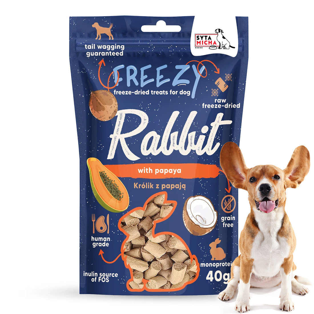 Zadbaj o zdrowie swojego pupila w naturalny sposób. Wybierz Syta Micha FREEZY – liofilizowane smaczki z królikiem, papają i kokosem, które pies pokocha od pierwszego kęsa!